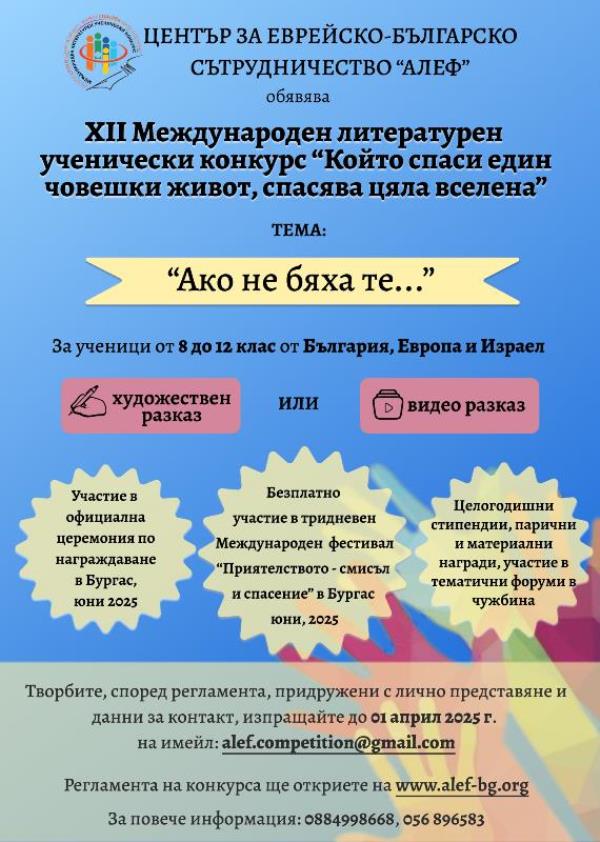 Център „Алеф” удължава срока за получаване на творби в дванадесетото издание на Международния литературен ученически конкурс „Който спаси един човешки живот, спасява цяла вселена” до 1 април 2025 година. До промяната се стигна поради големия интерес и многобройните запитвания от страна на учители и ученици в страната и чужбина.