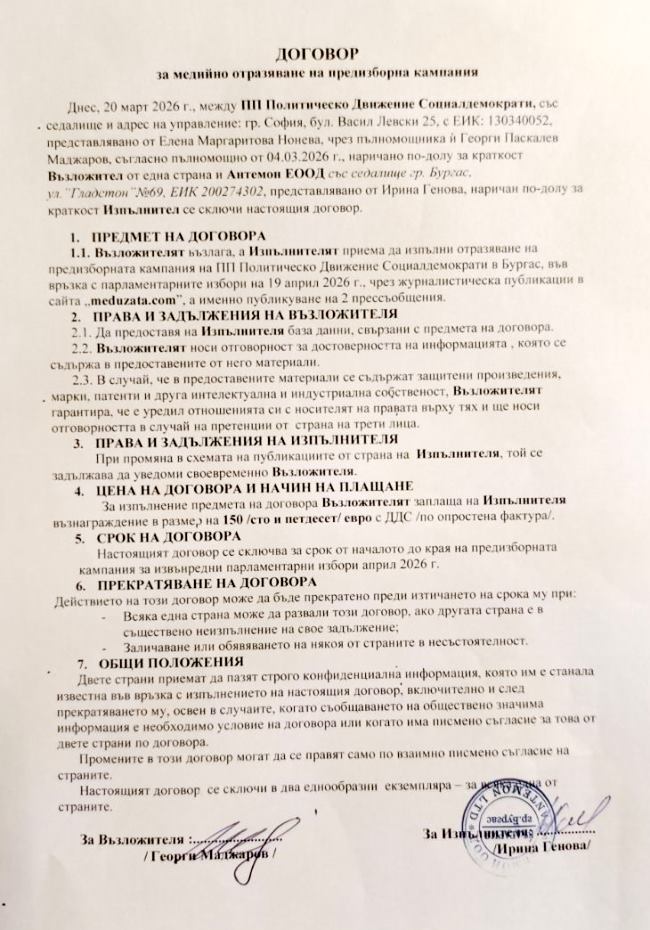 Договор за кампания за Извънредни парламентарни избори 2026 TwitterАнтемон ЕООД, собственик на информационен сайт meduzata.com подписа следния Договор за кампания за Извънредни парламентарни избори 2026 г. ОБЯВИ 21 Март 2026 Следваща