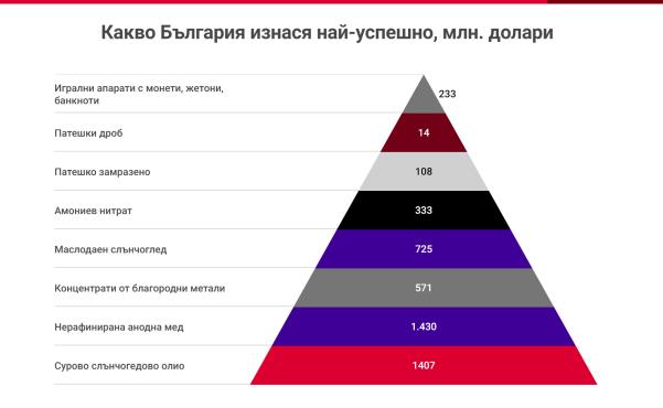 В долната графика се показани стоките, с износа на които България се справя най-успешно - при тях тя има голям дял от световния износ, макар невинаги това да се дължи на огромни обеми. България държи 36.7% от световния износ на патешки черен дроб, 26% от износа на замразено патешко месо и 18% от износа на прясно патешко месо, макар и не големи обеми - сумарно за около 150 млн. долара.