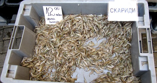 Скаридите в Бургас се харчат за 12 лева килото и това е независимо дали са гренландски или черноморски, увери се репортер на burgasdream.com. Първите са едри, но замразени, вторите – дребосъци, но живи.