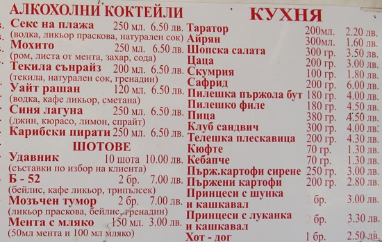 Цената на традиционните коктейли е 6.50 лв. „Мозъчен тумор“ е 7 лв. за два шота, мента с мляко – 3 лв. за 150 мл.