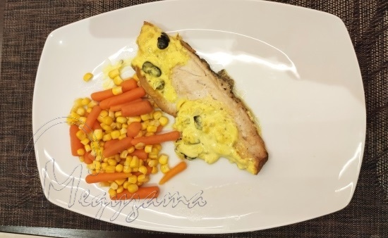 200 г лук, 50 г чесън, 100 г лимонов сок, 500 мл готварска сметана, 10 г Куркума (пудра), 5 г рибен бульон Хундаши, 40 г масло, 50 г каперси.