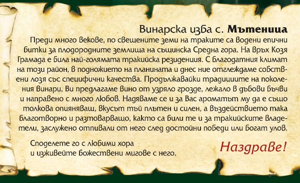 Ароматът му е опияняващ, вкусът плътен и силен, а въздействието благотворно и разтоварващо, както са били и за тракийските владетели, които отпивали от него след дойстойни победи и богат улов.