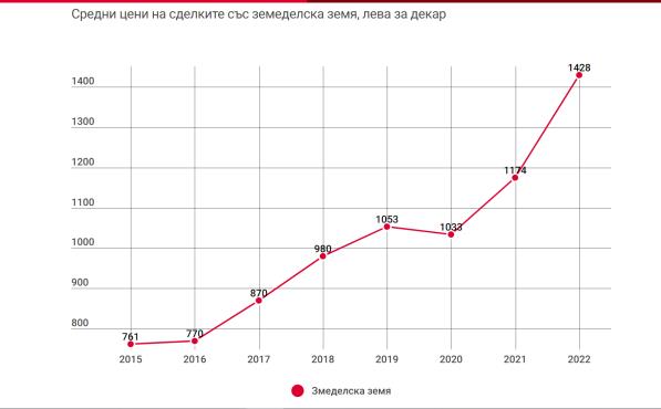 Средната цена, по която са се сключвали сделките през 2022 г., е била с 21.6% по-висока от година по-рано - 1 428 лв. за един декар.