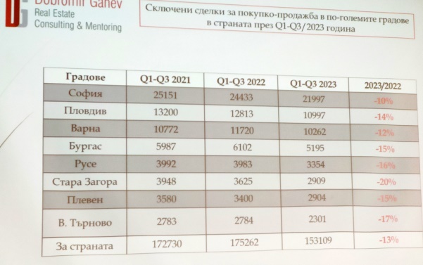 С 15% са били по-малко покупко-продажбите в Бургас, съобщи Добромир Ганев, бившият председател на Управителния съвет на Национално сдружение "Недвижими имоти". За страната общо спадът е 13%.