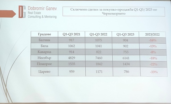 За Черноморието спадът на броя на сделките е най-голям в община Царево – 33%. За Несебър спадът е 18%. Прави впечатление обаче, че броят на сделките за деветмесечието в Несебър /и Слънчев бряг/ е по-голям от този в Бургас – 6141 срещу 5195.