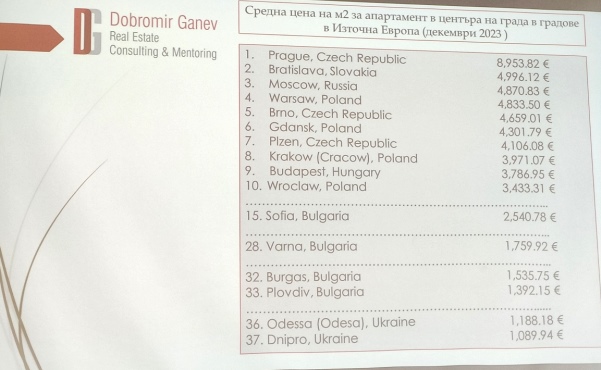 Ако сравним Бургас с Източна Европа, той се нарежда на 32-о място от общо 37. Там начело е Прага с 8 953 евро/кв.м, следвана от Братислава с 4 996 евро/кв.м.