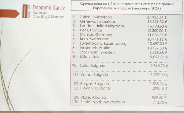Най-скъпо е в Цюрих, Швейцария, където квадрантият метър средно е 24 935 евро, следван от Женева с 18 821 евро. Лондон е на трето място с 16 193 евро/кв.м, а на четвърто е Париж с 12 300 евро/кв.м.