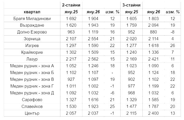 Най-силно поскъпване при жилищата с 2 стаи е в Славейков и Изгрев, съответно 25% и 22%. С 21% по-скъпо се оферират към началото на 2026 г. спрямо началото на 2025-та имотите в Зорница и Сарафово. Няколко са причините за по-силното поскъпване – добра инфраструктура и в близост до центъра на морския град. Също така има и доста оферти за жилища от първичния пазар.
