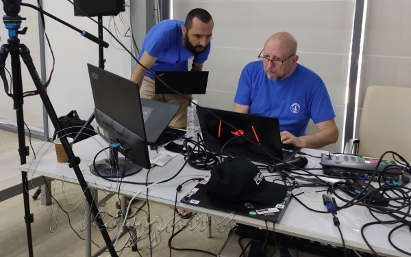 На входа се сканира всеки QR код и на всеки от участниците се слага гривна. Предлагат се морскосини тениски с логото на BurgasConf 2021, както и хубаво кафе.