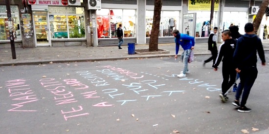 Младежът изографисваше буквите по асфалта без да му пука от минувачите. Все пак бе прикрил лицето си с шал до средата /очевидно без да знае за забраната на бурките/.