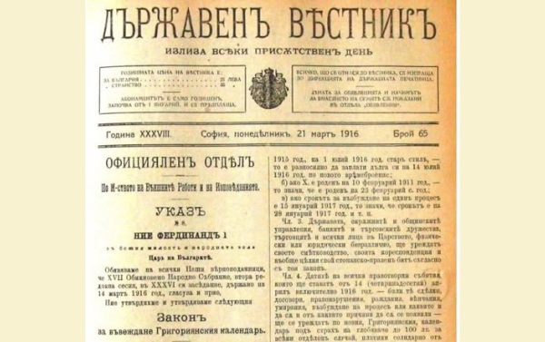 „От първий априлъ, хилядо деветстотин и шестнадесета година, времеброението въ Царство България става по новия стилъ – Григориянския календаръ.