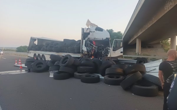 По платното има разпилян товар /гуми за камион./. До отстраняване на товара, както и самия ТИР, пътния трафик се пренасочва през отбивката за Камено и Българово.