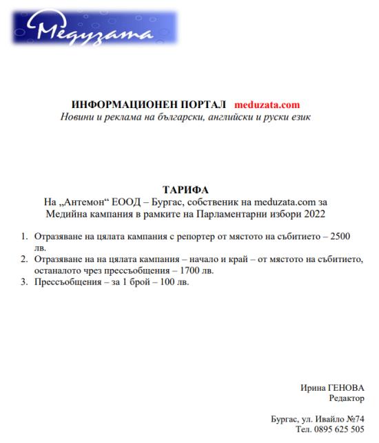 ТАРИФА за отразяване на Парламентарни избори TwitterИнформационен сайт meduzata.com публикува своята ТАРИФА за отразяване на Парламентарни избори 2021, които ще се проведат на 02 октомври 2022 г. ОБЯВИ 22 Август 2022 Предишна Следваща