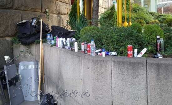 Кордон от полицаи обискират дамски чанти, торбивки и джобове на демонстрантите. Иззети са дезодоранти, флакони, дожри бутилки с минерална вода.