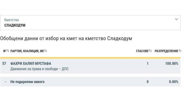 Кметът на крумовградското село Сладкодум Фахри Мустафа е избран със сто процента от гласувалите избиратели, съобщи БНР.
