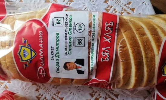 Кандидат за кмет и за общински съветник лъснаха на опаковката на хлябовете в Карнобат, установи meduzata.com.