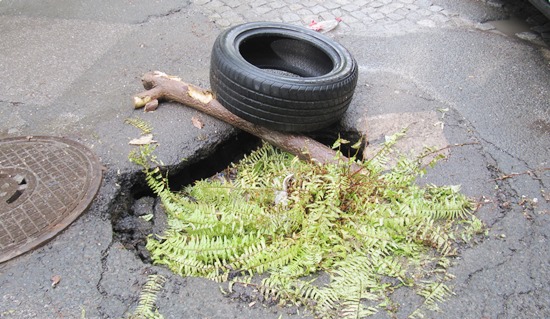 Трапът е сигнализиран с подръчни средства от обитатели на околните блокове. Стара гума от автомобил и накършени клони са забити в дупката. Самата яма е от пропадането на ул. Левски и е дълбока поне 50-60 см. По улицата често се отварят подобни „кратери“.