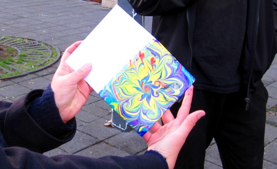 Артистичното дуо сърба тълпа около себе си буквално за минути. Художникът – майстор на техниката ербу дава на зяпачите да довършват рисунките му, под неговите напътствия. После ги отпечатва на картон във вид на картичка, която участникът си отнася вкъщи.