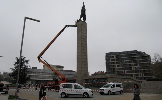 Районът пред монумента на незнайния войн бе затворен с оградителни ленти. На издигнатата автовишка двама експерти работят по десния крак на бронзовата статуя със специална техника.