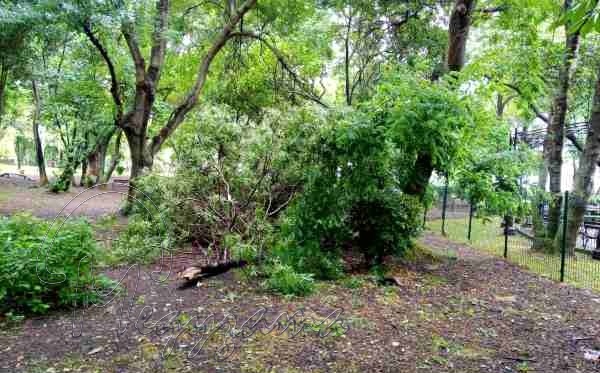 Със страшен пукот се строши и сгромоляса клон от старо дърво на кучешката площадка до Пантеона. Заради дъжда обаче на мястото нямаше нито хора, нито домашни любимци.