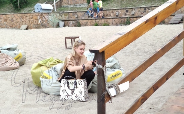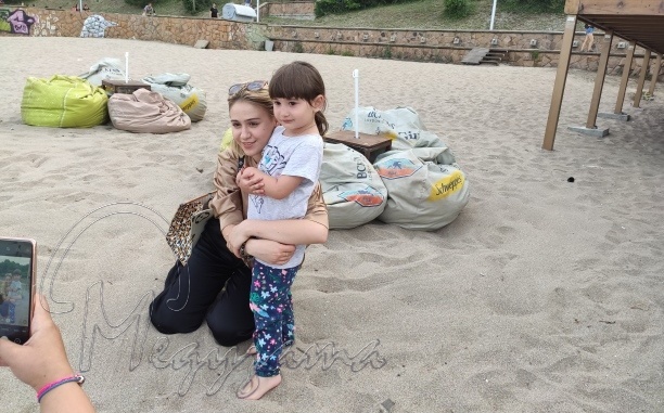 Мария Бакалова се отдели от родителите си и разговаря дълго по телефона, приседнала на „барбарон“ на пясъка. Тя снима панорамно наоколо, за да покаже събеседника си с красотата на бургаския залив.
