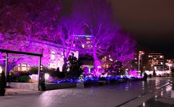 Чинарите и декоративните храсти блестят в различни светлини – преливащи се от синьо, през виолетово, червено, жълто и зелено.