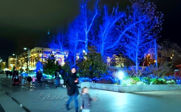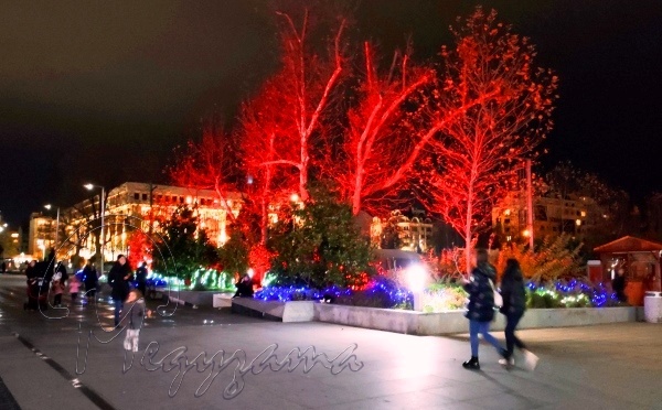 Поставени и живи елхи по Александровска. Клонките им са окичени с коледни топки. В основата на дръвчетата са монтирани прожекторчета, свързани с озвучителната система, по която ще се пуска музика за атмосфера през празничните дни. Така светлините ще танцуват върху елхите в нейния ритъм.