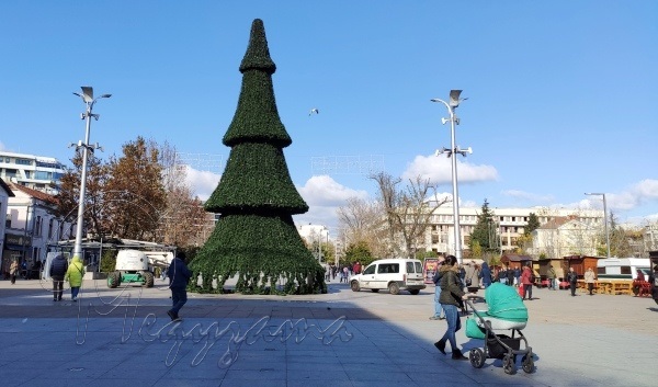 Издигната е металната конструкция и по нея са окичени зелените гирлянди, които имитират клонките. През следващата седмица коледното дърво ще бъде украсено с топки и хиляди лампички.