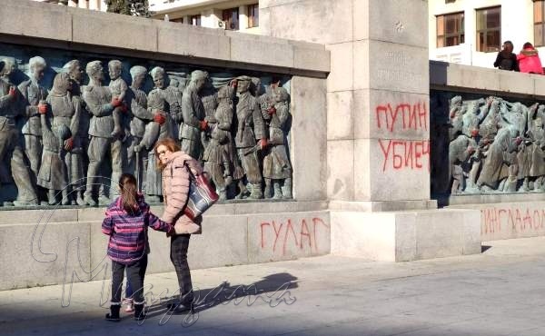 Така неизвестни изографисаха паметника на незнайния войн, като заклеймиха войната, която Русия започна срещу Украйна.