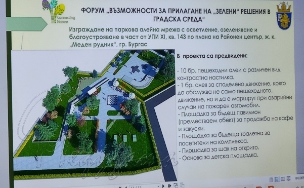 По време на форума арх. Емил Бурулянов, главен архитект на общината, представи идейни решения за развитието на зелената система на Бургас. Те са концентрирани към реновиране и създаване на нови зелени пространства в града, сред които парк „Света Троица“ в жк „Славейков“, парк „Минерални бани“ и парк „Меден рудник“.