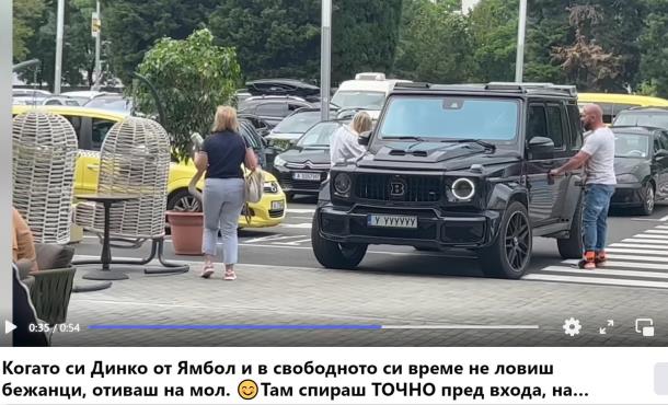 Видеото е заснето пред бургаския Мол Галерия. Джипът му с регистрационен номер У УУУУУУ, стоял напреки на пътя, докато наглият ямболлия обекалял с актуалната блондинка в мола.