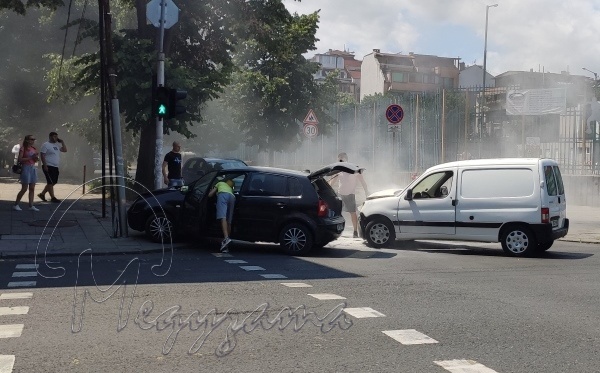 Пежо, тип баничарка, пламна при сблъсък с лек автомобил Фолксваген на ул. "Христо Ботев" в Бургас. Точното мясно на инцидента е на кръстовището до Подземната улица.