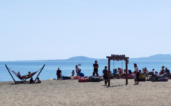 Въпреки че няма температурни рекорди, днес плажът в Бургас се напълни. Жегата се усеща като юнска, при все, че е 14 април.