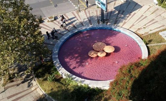 Фонтанът на бул. Демокрация, в жк Лазур в Бургас се оцвети в розово. Това се вижда на фотоса, сниман отвисоко от журналиста Стефан Баев.