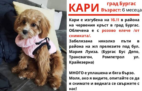 Кученцето Кари изчезна на 16 ноември в Бургас, в района на БЧК. Собствениците й не спират да я търсят и обявиха 2000 лв. възнаграждение за този, който я намери.