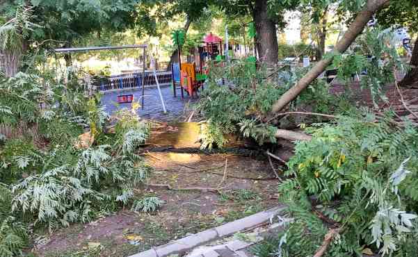 Поройният дъжд, придружен със силен вятър е потрошил клоните на дървета на детска площадка в Бургас, видя репортер на meduzata.com.