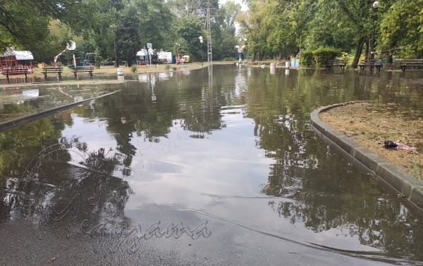 След невижданите жеги, страшна буря с пороен дъжд удари Бургас. В рамките на няма и половин час се изсипаха тонове вода над града, шахтите не можеха да поемат стичащите се по улиците потоци.