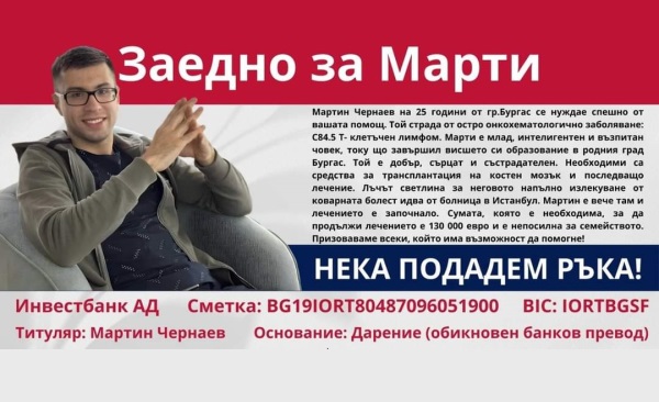 Нужни са 130 000 евро за живота на 25-годишния Мартин Чернаев от Бургас. Той е диагностициран с онко-хематологично заболяване.