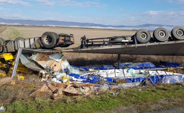 самостоятелно катастрофира, преобръщайки се в крайпътна канавка, т.а. “Волво” - влекач с прикачено полуремарке.
