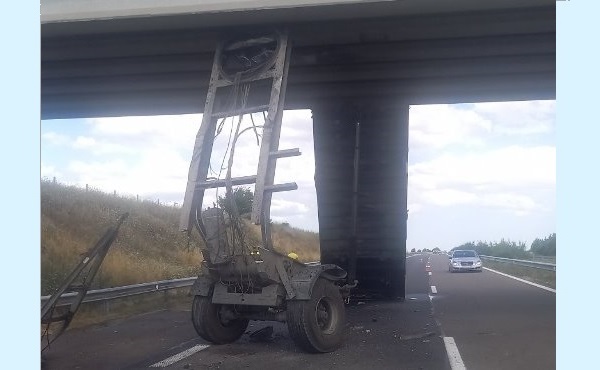 В 16.20 ч. в района на км. 335 км по автомагистрала Тракия /община Карнобат/ товарен автомобил, движещ се в посока София, вероятно с несвалено ремарке, при преминаване под надлез и несъобразяване на височината, е заклещил ремаркето между пътното платно и надлеза, като същото се е откъснало и запушило дясната пътна лента.