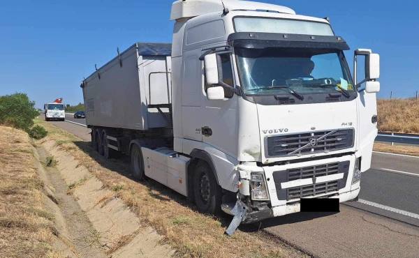 В 09.07 ч на автомагистрала “Тракия”, км 331 в посока Бургас, т.а. “Волво” /натоварен с пшеница/, управляван от 56-годишен мъж от Сливен, поради разсейване от страна на водача,