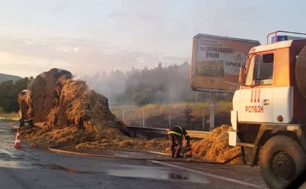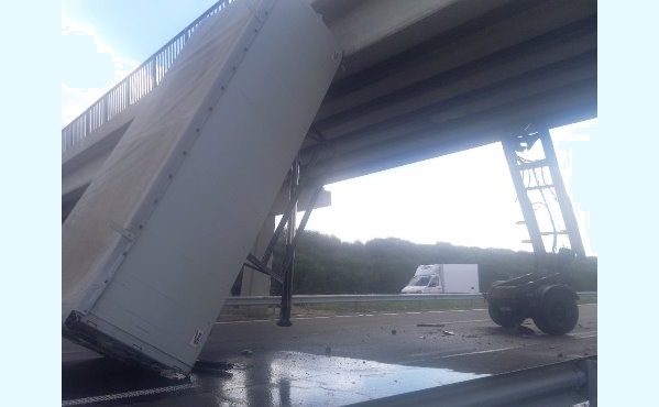 В 16.20 ч. в района на км. 335 км по автомагистрала Тракия /община Карнобат/ товарен автомобил, движещ се в посока София, вероятно с несвалено ремарке, при преминаване под надлез и несъобразяване на височината, е заклещил ремаркето между пътното платно и надлеза, като същото се е откъснало и запушило дясната пътна лента.